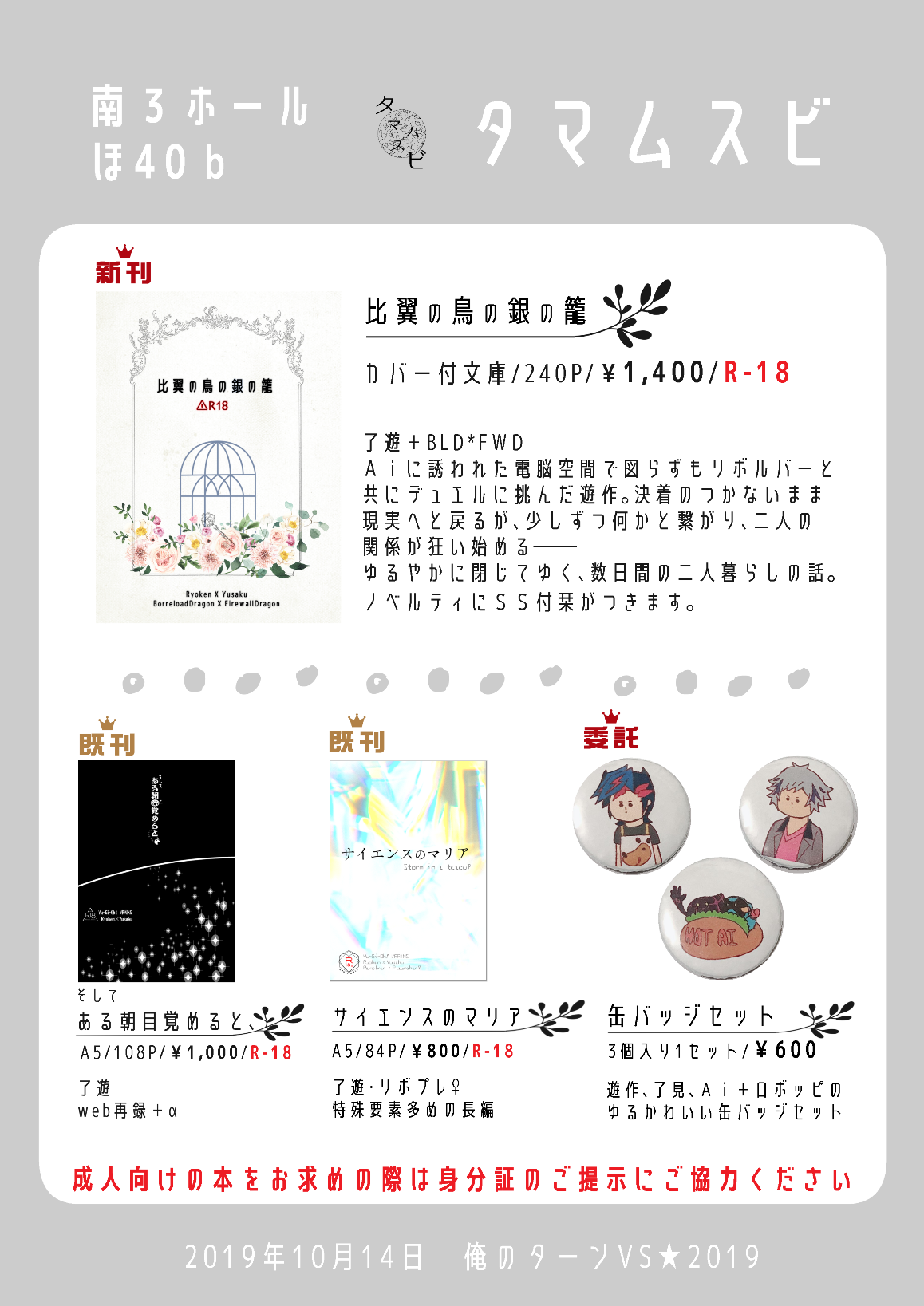 スペースは南3ほ40b「タマムスビ」です。詳細はpixivのおしながきをご覧ください。